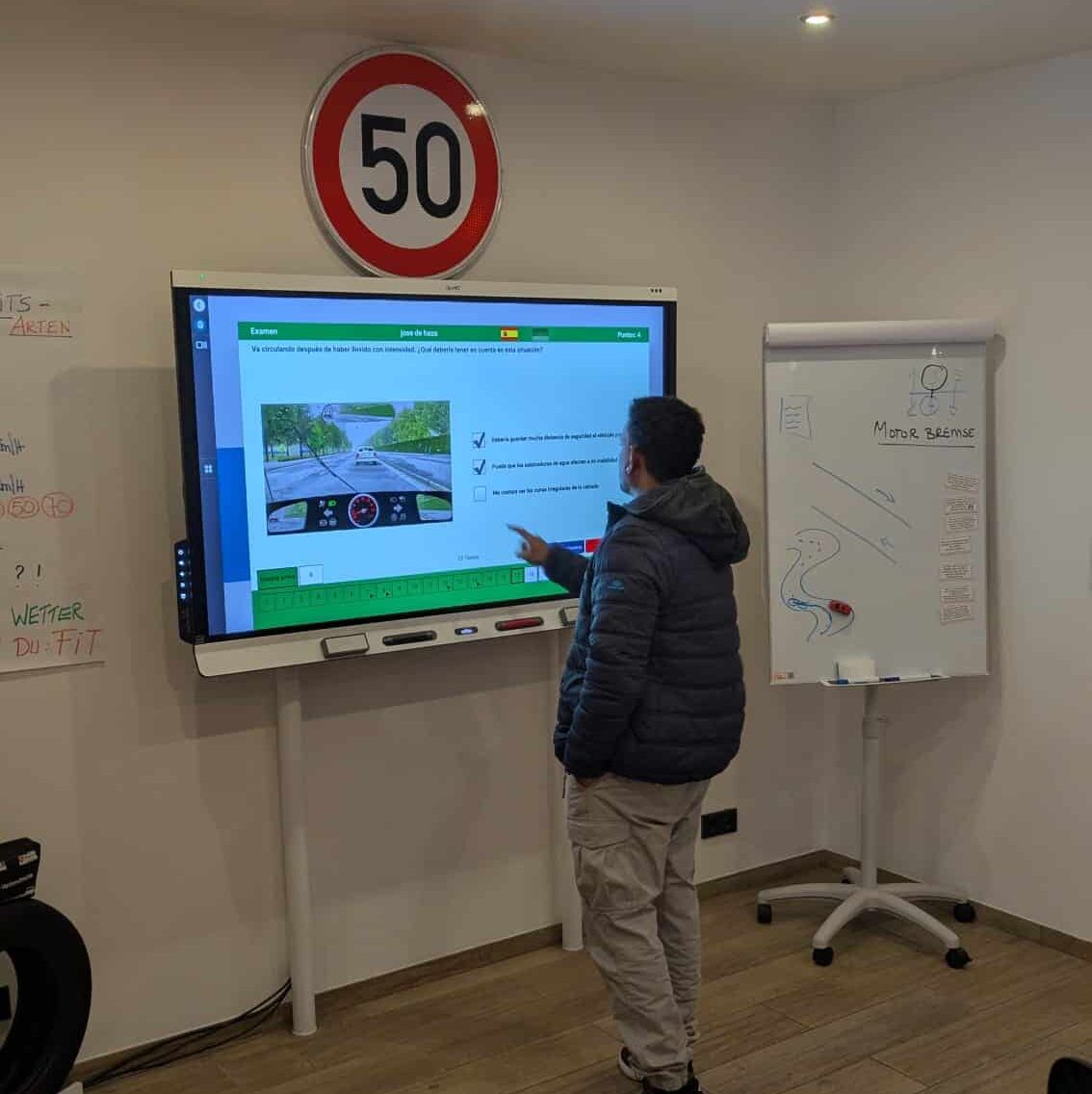Die theoretische Prüfung besteht aus einem Multiple-Choice-Test, der in einem Vortest am PC bei uns in der Fahrschule absolviert wird. In einem Prüfungszentrum (TÜV) wird dann der echte Test absolviert. Du musst 30 Fragen richtig beantworten, um zu bestehen. Die genaue Anzahl und der Schwierigkeitsgrad der Fragen hängen von der Führerscheinklasse ab.